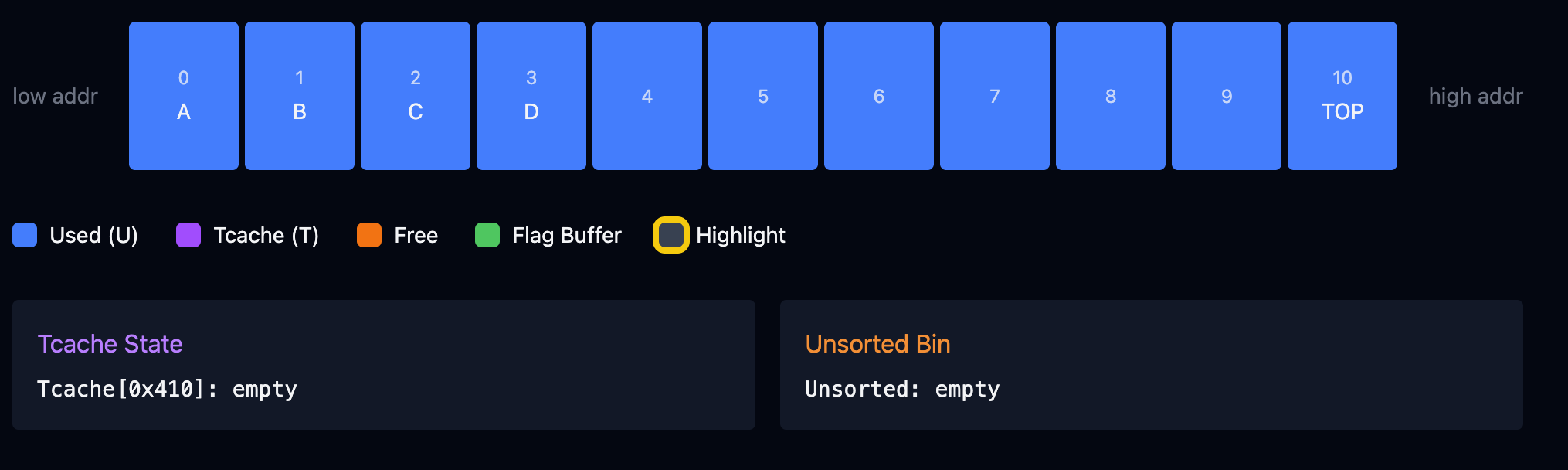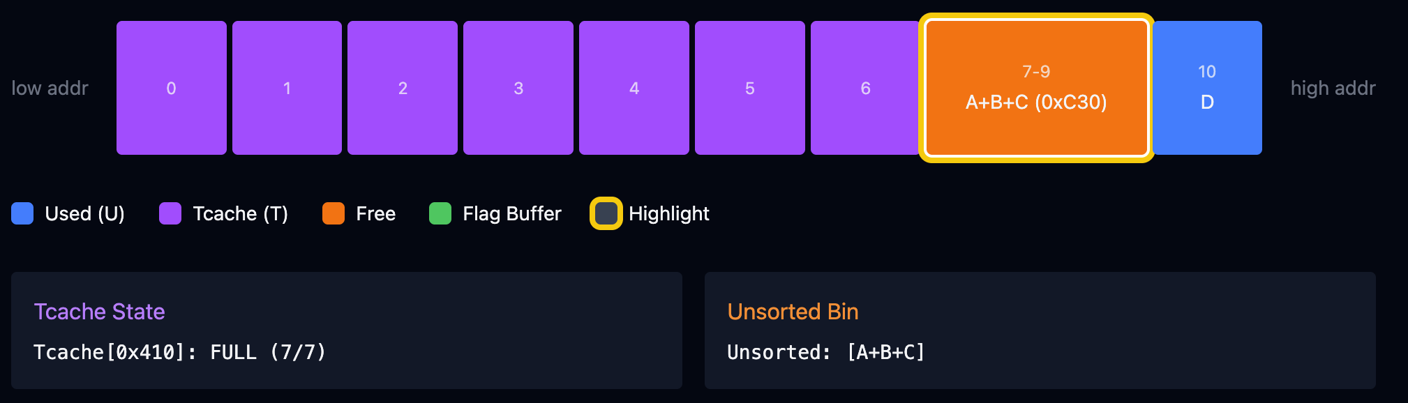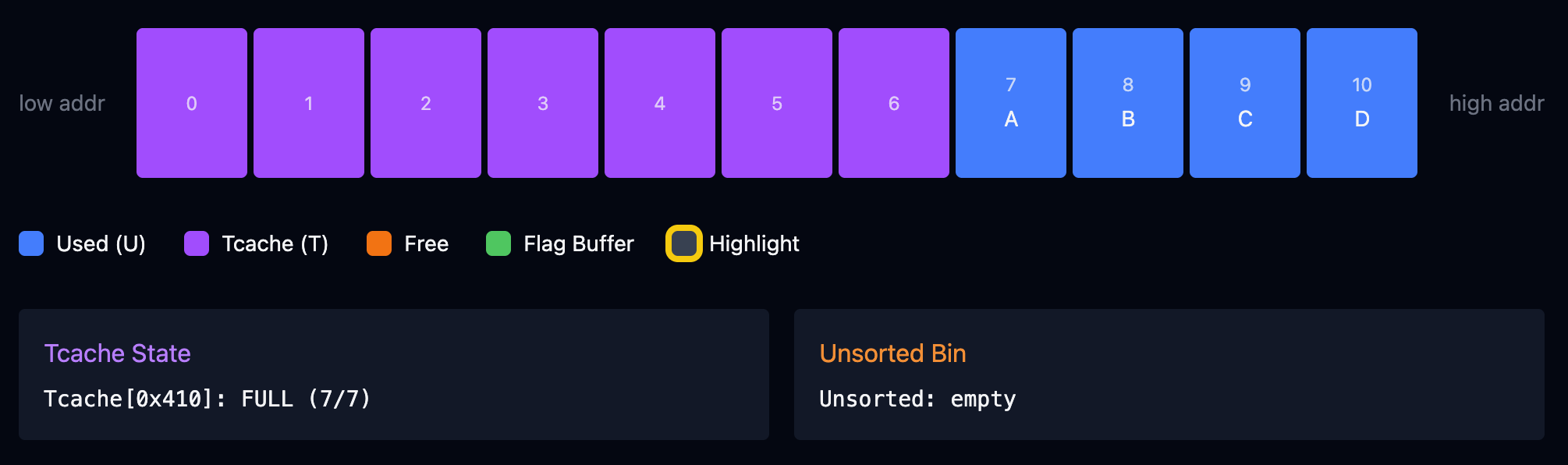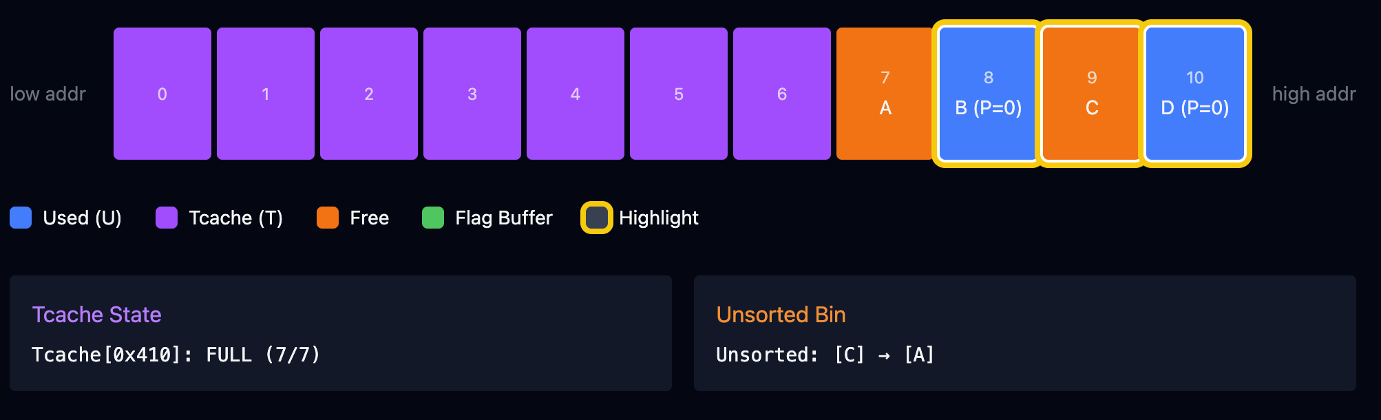 - Don't free before every allocation is in place. If you free and then allocate, the new allocations come straight back out of tcache in LIFO order. Your chunks land at reused addresses, and tcache ends up too empty to block the consolidation frees later.