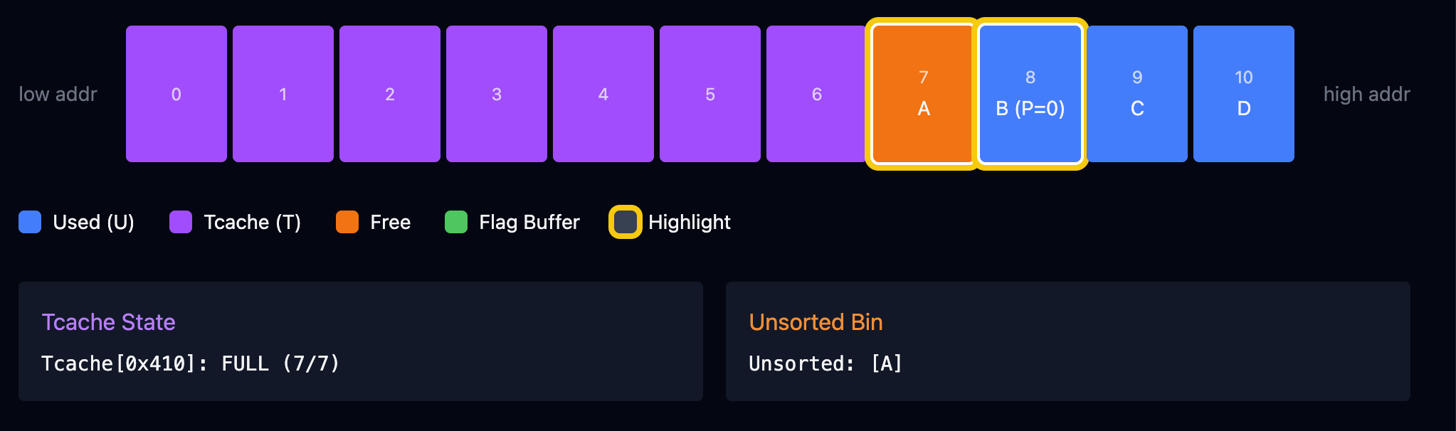 What you cannot do is let any of these frees happen while tcache has room. Tcache accepts the free silently, no PREV_INUSE bit gets cleared, and the whole scheme collapses.