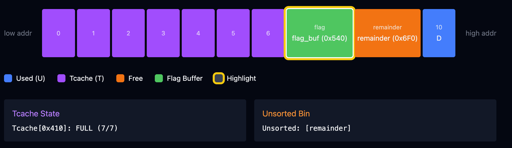 0..6to filltcache[0x410]to 7/7. free(7)so A lands in unsorted (alone).free(9)so C lands in unsorted (alone).free(8)so B triggers a three-way merge: A, B, and C become one0xC30chunk in unsorted.read_flagcallsmalloc(0x52a), which carves0x540off the head of the merged chunk. The head address is exactly A's base, which is still the value inallocations[7].puts(7)reads the flag through that stale pointer.