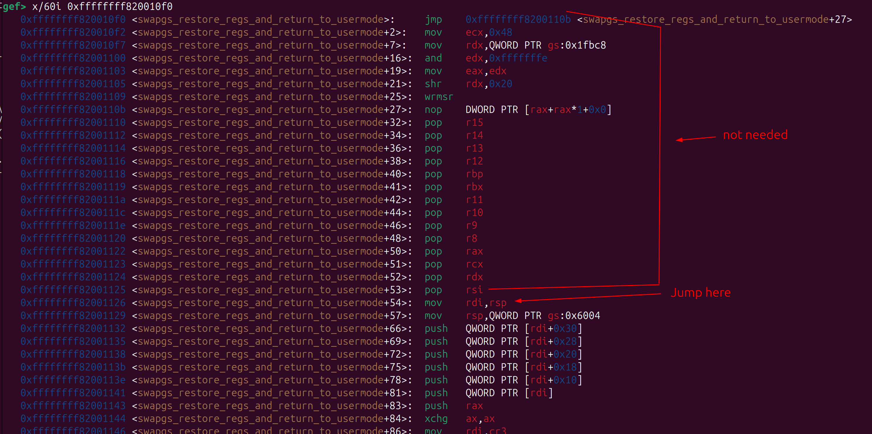 otherwise we have to set all the pop instructions that are used in the function. So we redirect to swapgs_iret +0x36> mov rdi, rsp
